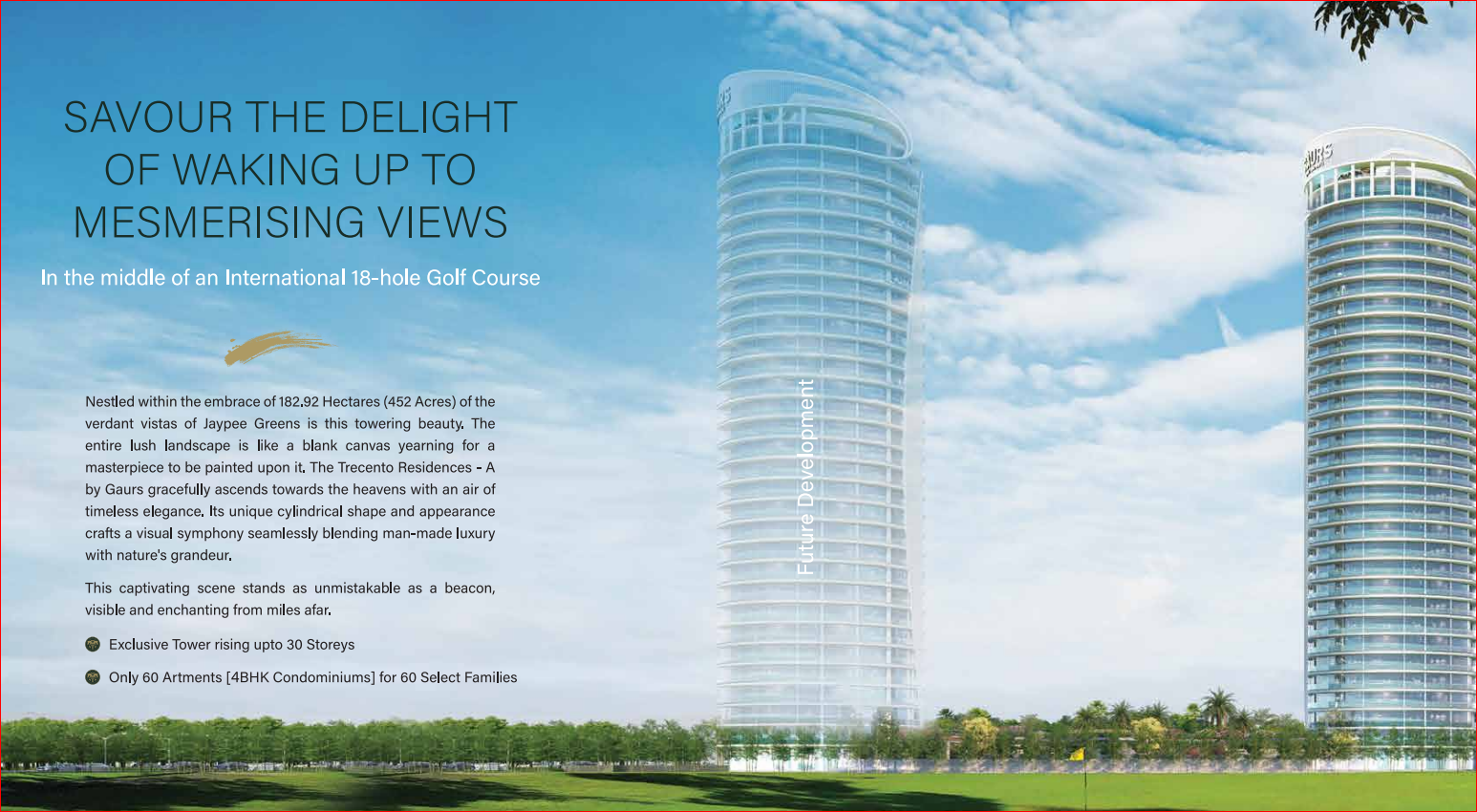 Nestled within the embrace of 182.92 Hectares (452 Acres) of the verdant vistas of Jaypee Greens is this towering beauty. The entire lush landscape is like a blank canvas yearning for a masterpiece to be painted upon it. The Trecento Residences - A by Gaurs gracefully ascends towards the heavens with an air of timeless elegance. Its unique cylindrical shape and appearance crafts a visual symphony seamlessly blending man-made luxury with nature's grandeur.